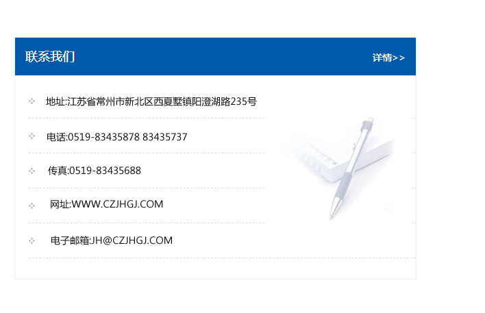 傳真:0519-83435688    郵編:213135    網址:WWW.czjhgj_com.haishengqianshui.com    電子郵箱:JH@czjhgj_com.haishengqianshui.com
